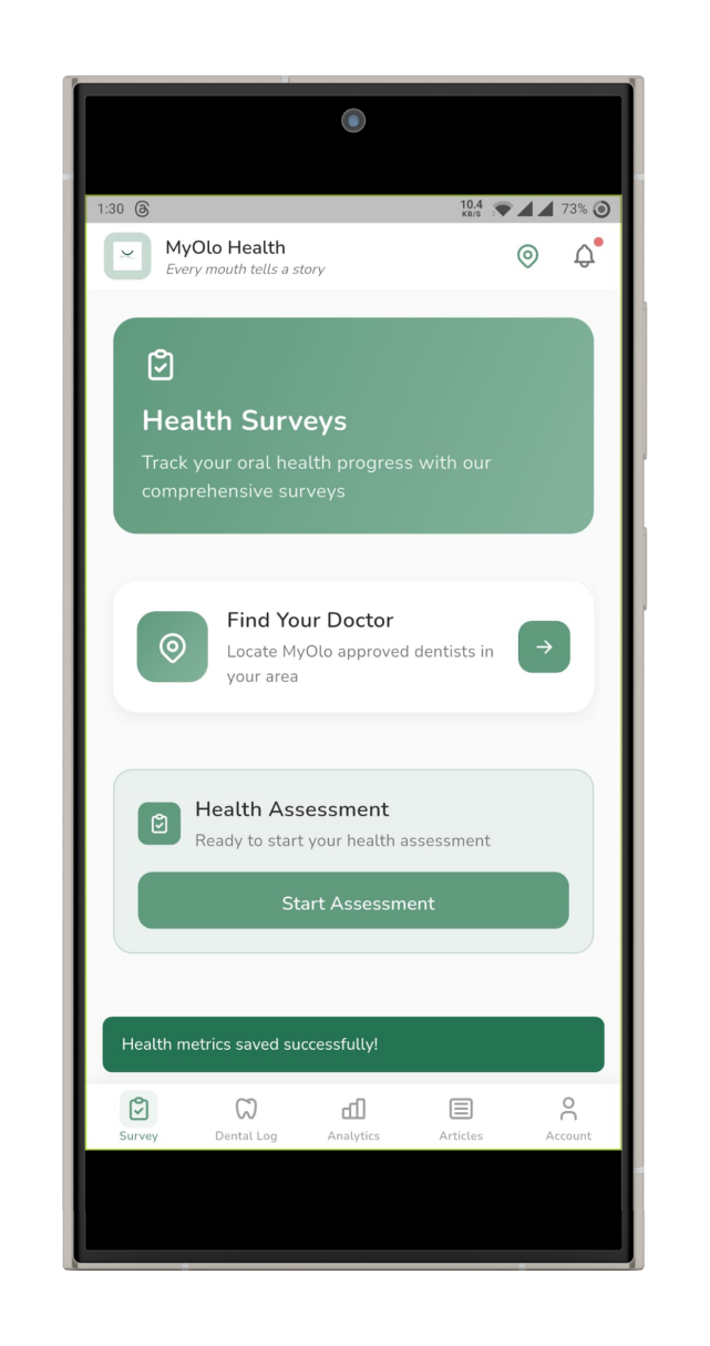 My Olo Health is a smart oral health app designed to help you track your habits, assess your risks, and improve your overall wellness. From brushing reminders and flossing logs to self-assessment surveys and personalized reports, our app gives you the tools to maintain a healthy smile and a healthy body. Because oral health is the foundation of total well-being.
